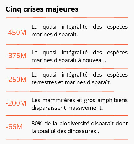 L'évolution des espèces est marquée par des périodes d'extinction massive. Aujourd'hui, le taux d'extinction des espèces, 100 à 1 000 fois plus rapide que le taux naturel d'extinction, marque l'entrée dans la sixième extinction de masse de la biodiversité.