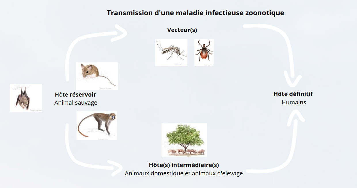 D'une manière générale, les agents pathogènes sont hébergés par des animaux qu'on appelle "réservoirs", qui sont des porteurs sains, car ils ne développent aucun signe clinique d'infection. Ils ont alors deux manières de contaminer les humains: soit ils passent par un vecteur de transmission, comme les moustiques (paludisme) ou les tiques (maladie de Lyme); soit ils passent par un "hôte intermédiaire" , qui leur permet de muter et de s'adapter à de nouvelles espèces (grippe ou Ebola). Certains hôtes intermédiaires facilitent cette transmission, comme les primates ou les porcs, avec qui nous partageons respectivement 99% et 95% de nos gènes. Dans certains cas, les humains peuvent être infectés par des agents zoonotiques en entrant en contact avec les déjections des rongeurs réservoirs (maladies à hantavirus, leptospirose).